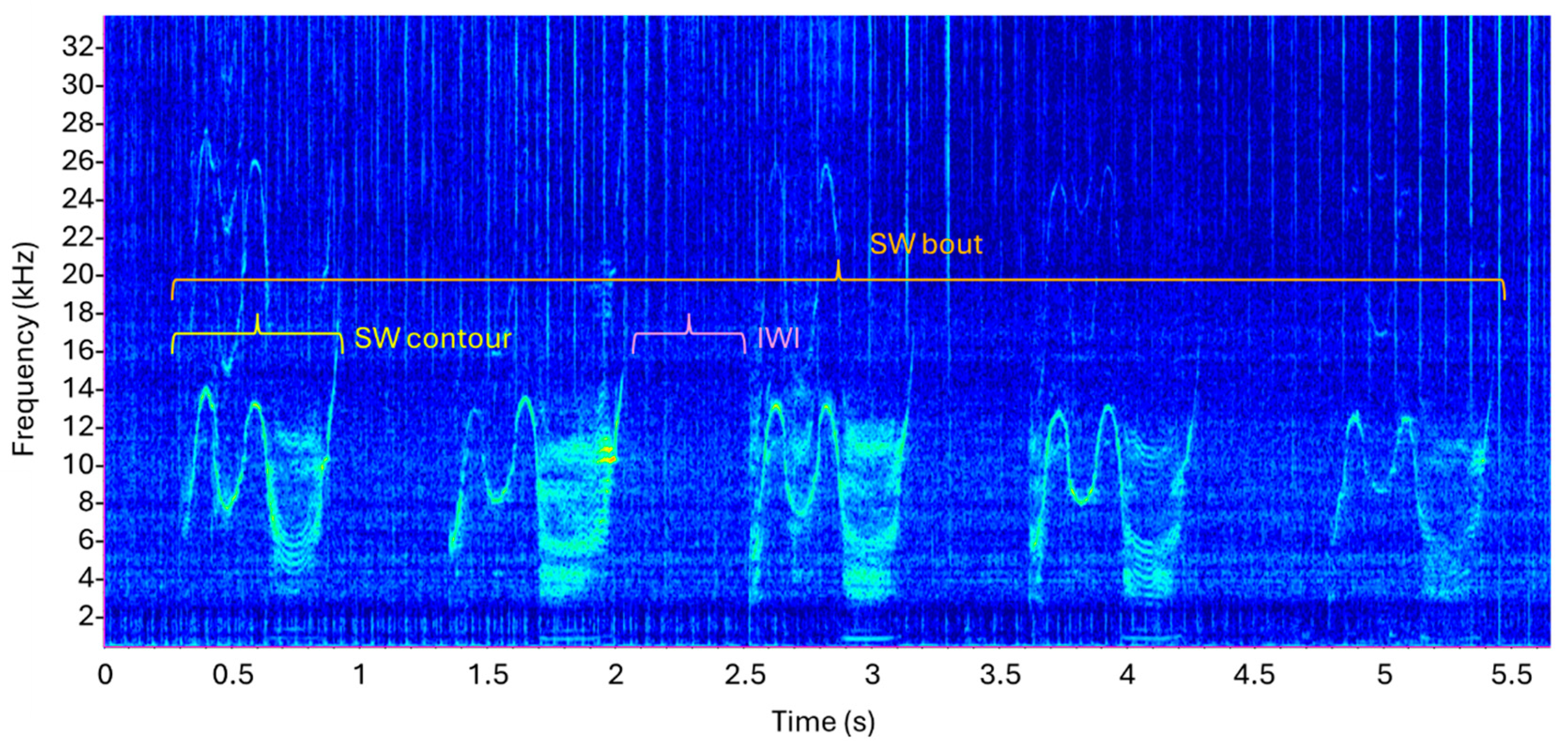 - Ovsyanikova, E.; McGovern, B.; Hawkins, E.; Huijser, L.; Dunlop, R.; Noad, M. Balance between stability and variability in bottlenose dolphin signature whistles offers potential for additional information. J. Acoust. Soc. Am. 2025, 157, 2982–2993. [Google Scholar] [CrossRef]