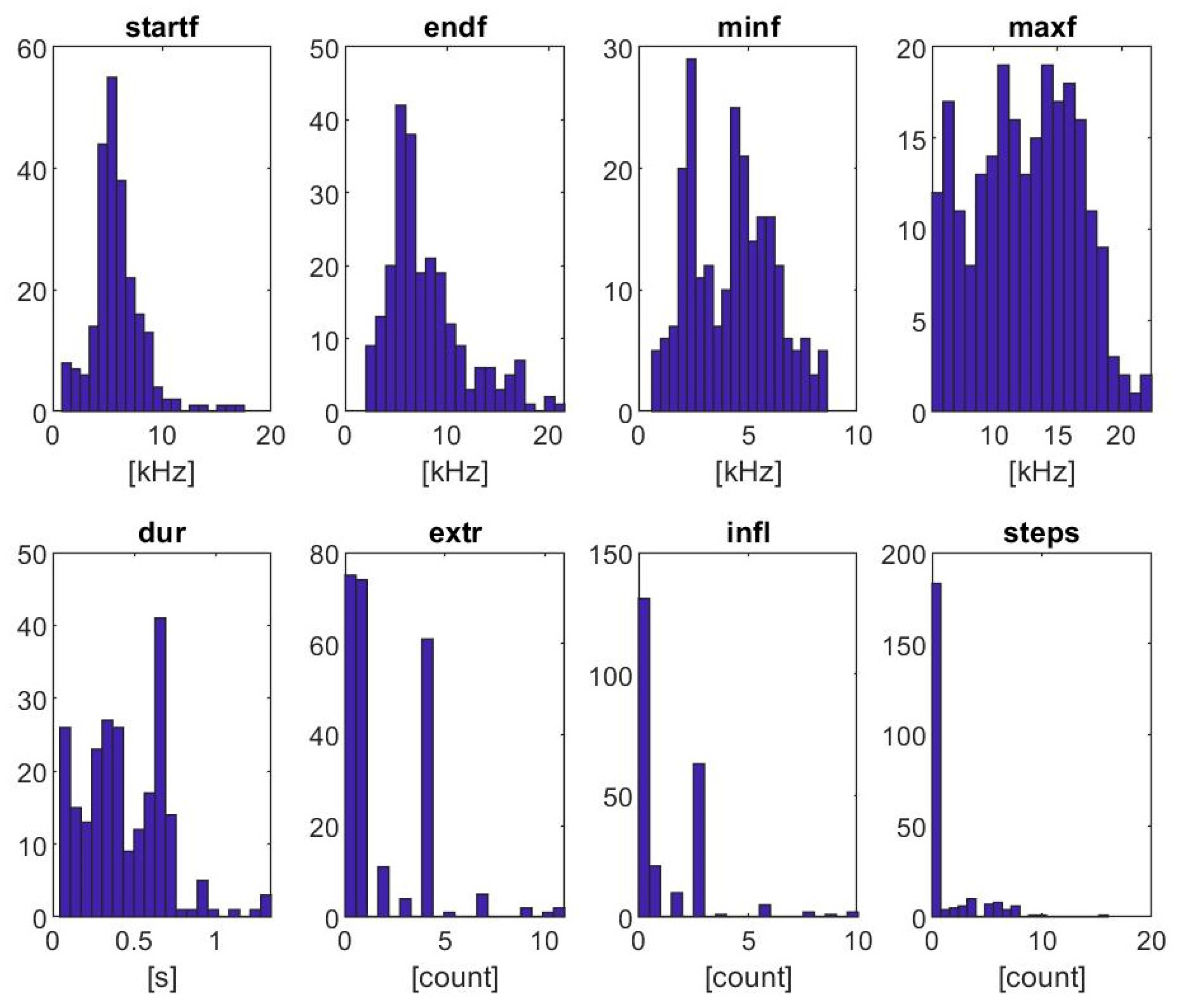 | Start Frequency [kHz] | End Frequency [kHz] | Min Frequency [kHz] | Max Frequency [kHz] | Duration [s] | Extrema [#] | Inflection Points [#] | Steps [#] | |