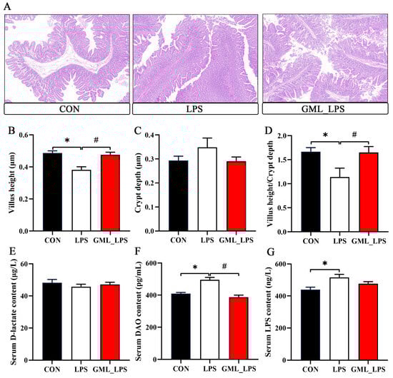 Effects of dietary GML supplementation on intestinal morphology in piglets challenged with LPS. (A) HE staining of piglet jejunum. Scale bar, 200 μm; (B–D) Jejunal villus height, jejunal crypt depth, and ratio of villus height to crypt depth in piglets; (E–G) Serum D-lactate, DAO, and LPS concentrations in piglets. DAO, diamine oxidase; LPS, lipopolysaccharide. * p < 0.05 as compared with the CON group; # p < 0.05 as compared with the LPS group.