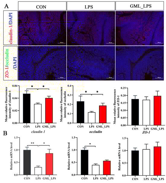 Effects of dietary GML supplementation on tight junction proteins in piglets challenged with LPS. (A) Typical images of immunofluorescence staining of claudin-1, occludin, and ZO-1 in the colon (500× magnification); (B) mRNA levels of claudin-1, occludin, and ZO-1. * and **: p < 0.05 as compared with the CON group.