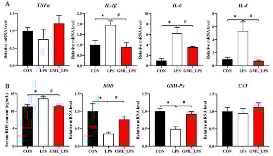 Effects of dietary GML supplementation on inflammatory factors and antioxidant enzymes in piglets challenged with LPS. (A) mRNA levels of TNF-α, IL-1β, IL-6, and IL-8; (B) Serum ROS concentration and mRNA levels of SOD, GSH-Px, and CAT. ROS, reactive oxygen. * p < 0.05 as compared with the CON group; # p < 0.05 as compared with the LPS group.