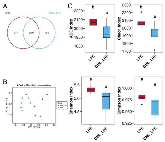 Effects of dietary GML supplementation on the α-diversity of gut microbiota in piglets challenged with LPS. (A) Venn diagram of OTUs; (B) Principal coordinate analysis (PCoA) of gut microbiota; (C) ACE index, Chao1 index, Shannon index, and Simpson index. a,b Different letters indicate differences between groups.