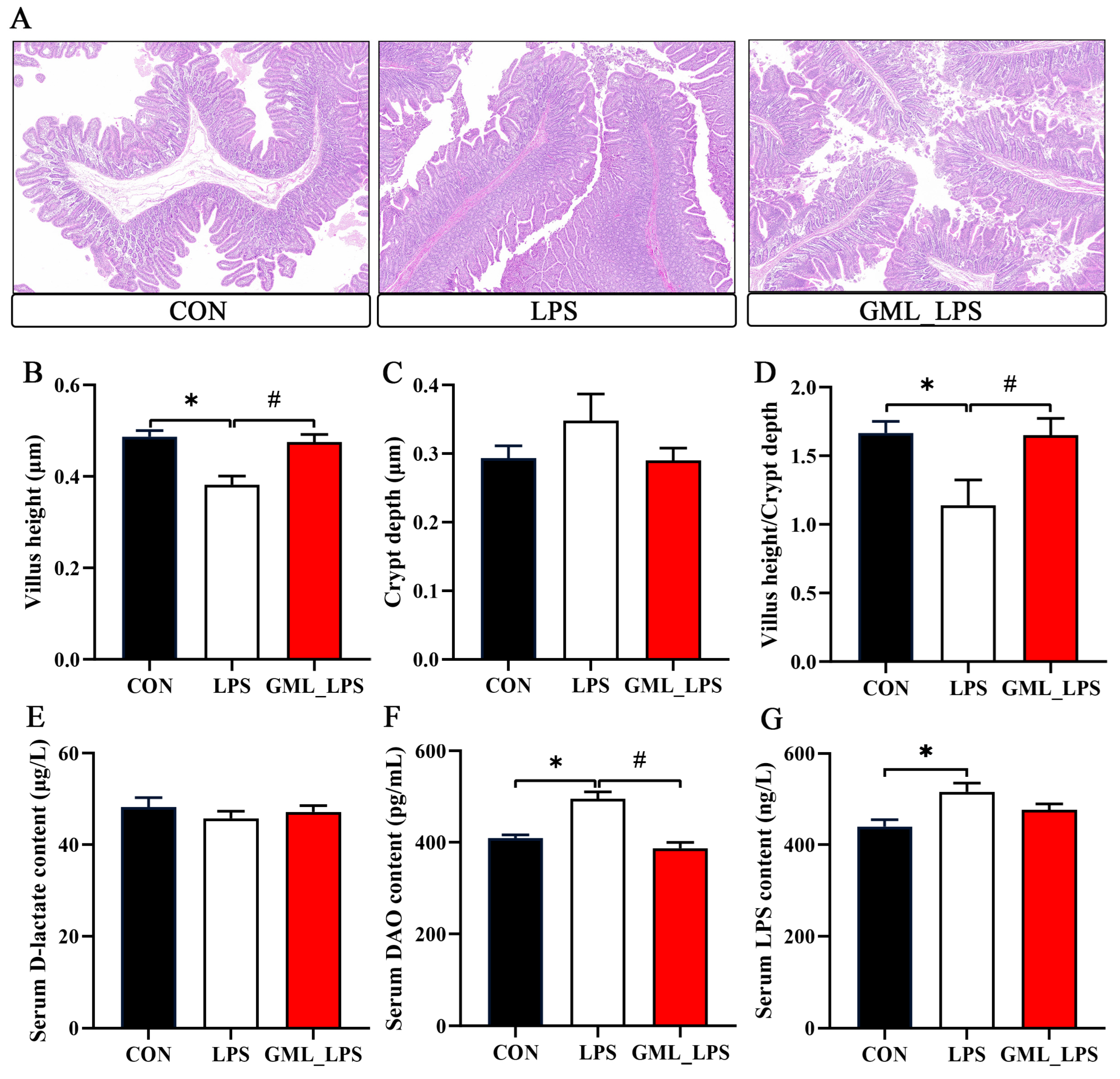 Figure 1. Effects of dietary GML supplementation on intestinal morphology in piglets challenged with LPS. (A) HE staining of piglet jejunum. Scale bar, 200 μm; (BD) Jejunal villus height, jejunal crypt depth, and ratio of villus height to crypt depth in piglets; (EG) Serum D-lactate, DAO, and LPS concentrations in piglets. DAO, diamine oxidase; LPS, lipopolysaccharide. * p < 0.05 as compared with the CON group; # p < 0.05 as compared with the LPS group.