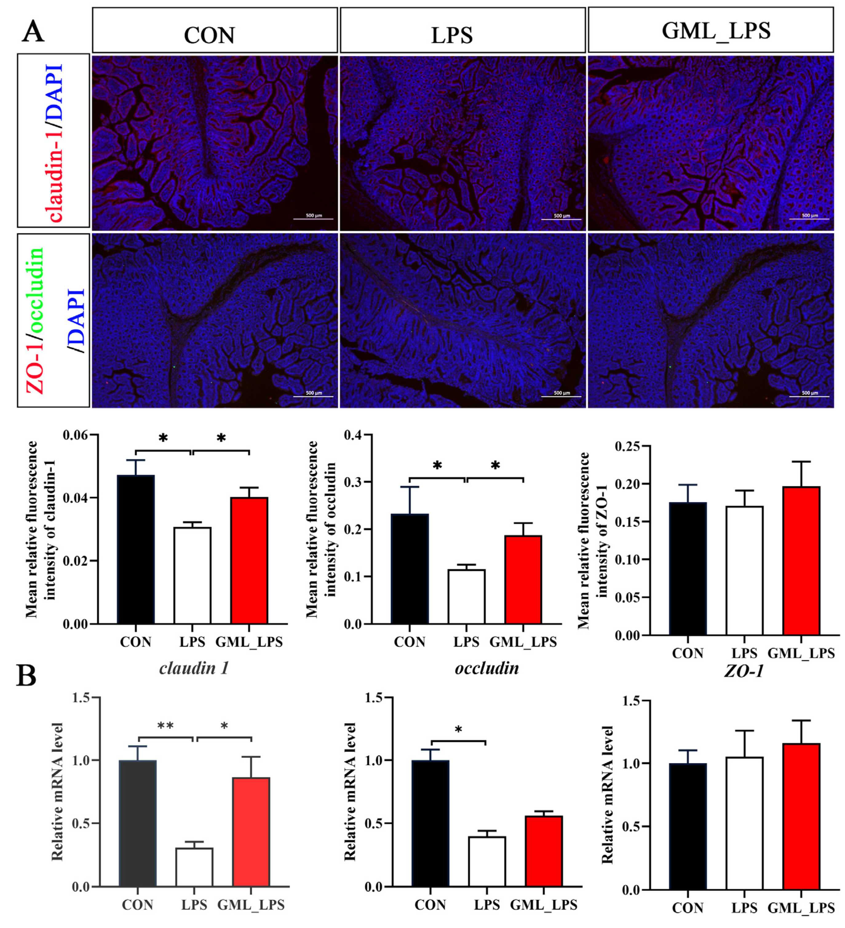 Figure 2. Effects of dietary GML supplementation on tight junction proteins in piglets challenged with LPS. (A) Typical images of immunofluorescence staining of claudin-1, occludin, and ZO-1 in the colon (500× magnification); (B) mRNA levels of claudin-1, occludin, and ZO-1. * and **: p < 0.05 as compared with the CON group.