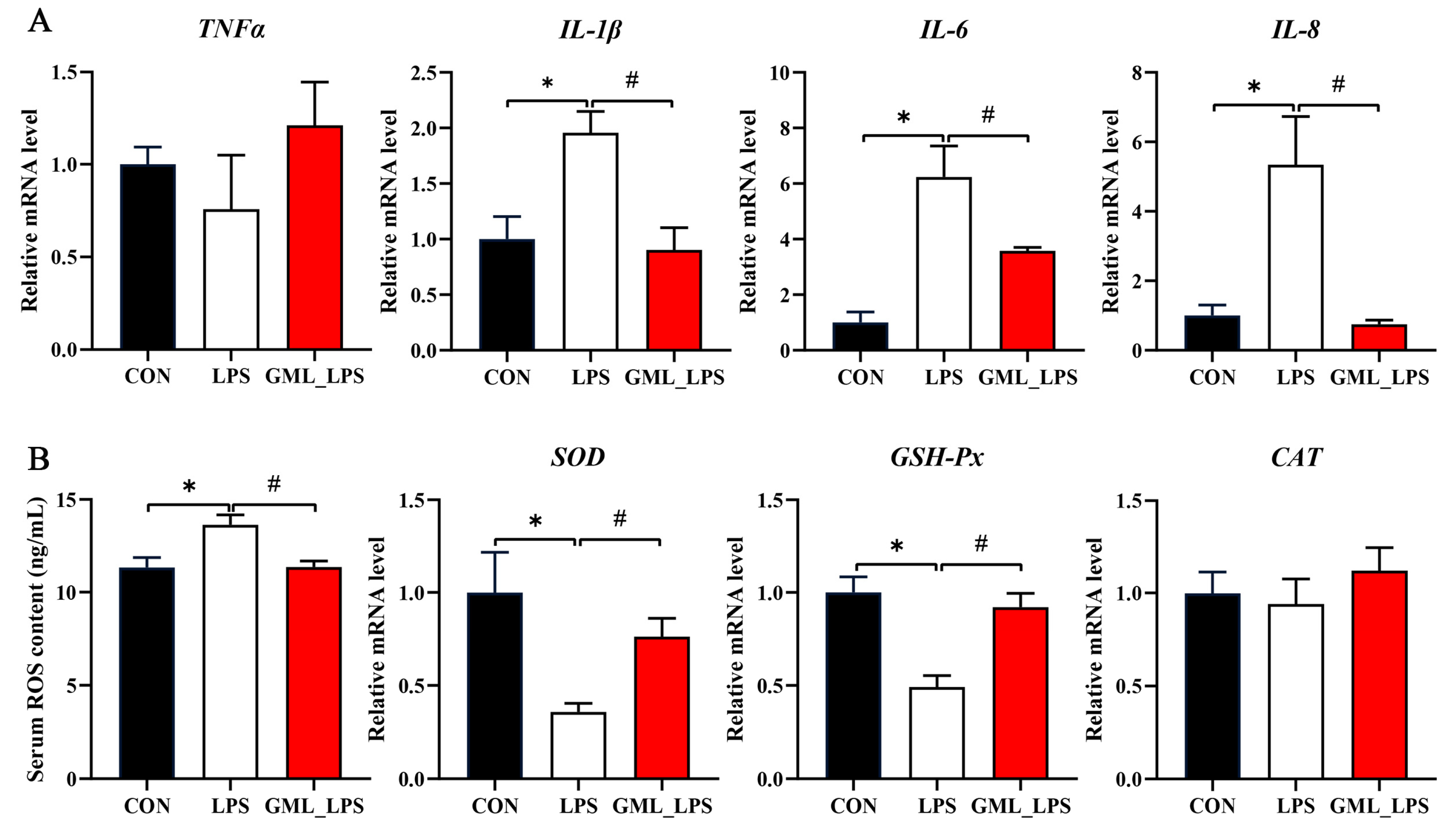 Figure 3. Effects of dietary GML supplementation on inflammatory factors and antioxidant enzymes in piglets challenged with LPS. (A) mRNA levels of TNF-α, IL-1β, IL-6, and IL-8; (B) Serum ROS concentration and mRNA levels of SOD, GSH-Px, and CAT. ROS, reactive oxygen. * p < 0.05 as compared with the CON group; # p < 0.05 as compared with the LPS group.