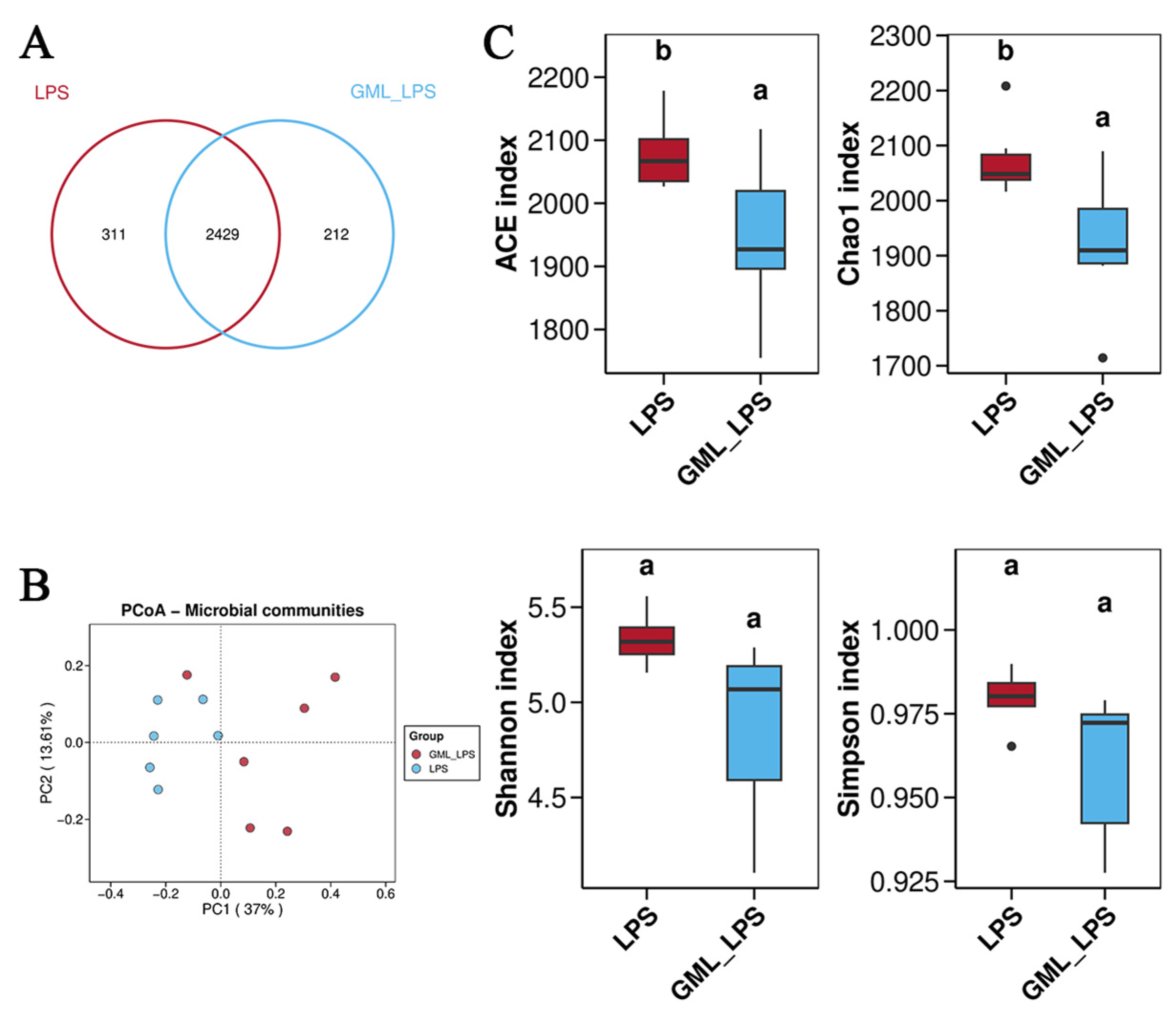 Figure 4. Effects of dietary GML supplementation on the α-diversity of gut microbiota in piglets challenged with LPS. (A) Venn diagram of OTUs; (B) Principal coordinate analysis (PCoA) of gut microbiota; (C) ACE index, Chao1 index, Shannon index, and Simpson index. a,b Different letters indicate differences between groups.