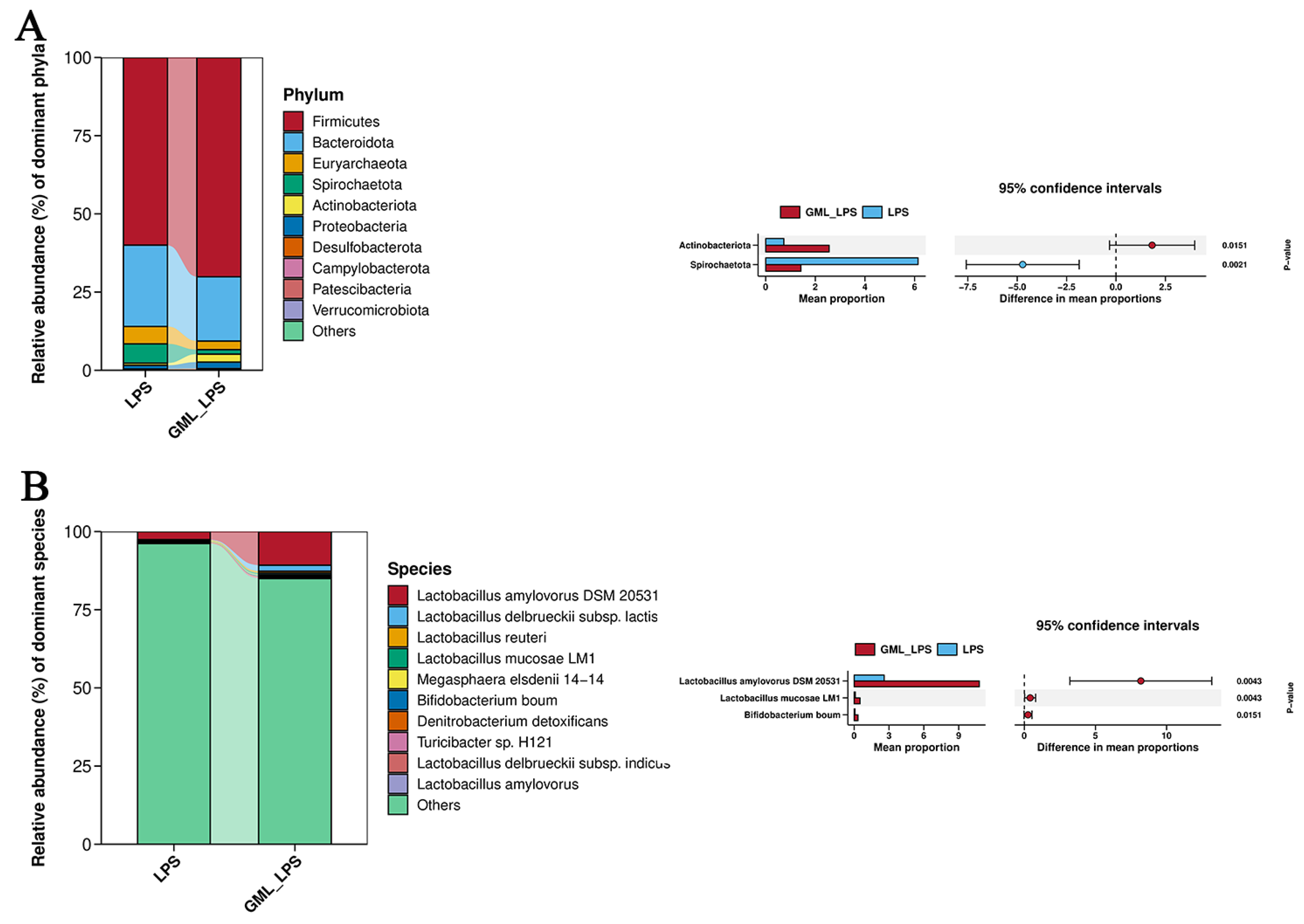 Figure 5. Effects of GML treatment on intestinal bacterial communities of piglets. (A) Abundance of the intestinal microbiota at the phylum levels; (B) Abundance of the intestinal microbiota at the species levels.