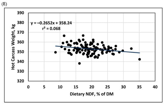 Study-adjusted relationships between growth performance data and dietary concentration of neutral detergent fiber (NDF): (A) Dry matter intake (DMI), % of body weight (BW); (B) dry matter intake, kg/d; (C) average daily gain (ADG), kg/d; (D) gain–feed ratio; and (E) hot carcass weight, kg. The blue-black dashed line in each figure represents the regression equation.