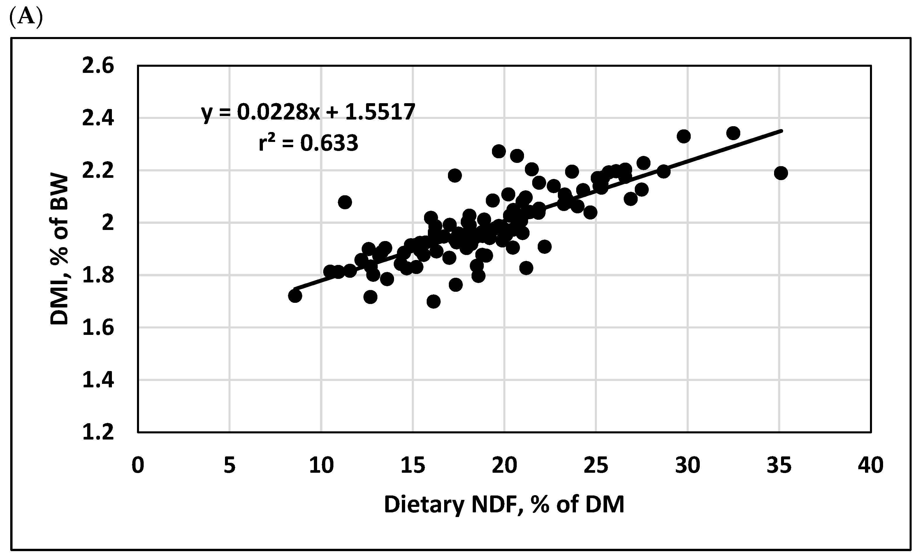 5. Arelovich, H.M.; Abney, C.S.; Vizcarra, J.A.; Galyean, M.L. Effects of dietary neutral detergent fiber on intakes of dry matter and net energy by dairy and beef cattle: Analysis of published data. Prof. Anim. Sci. 2008, 24, 375–383. [Google Scholar] [CrossRef]