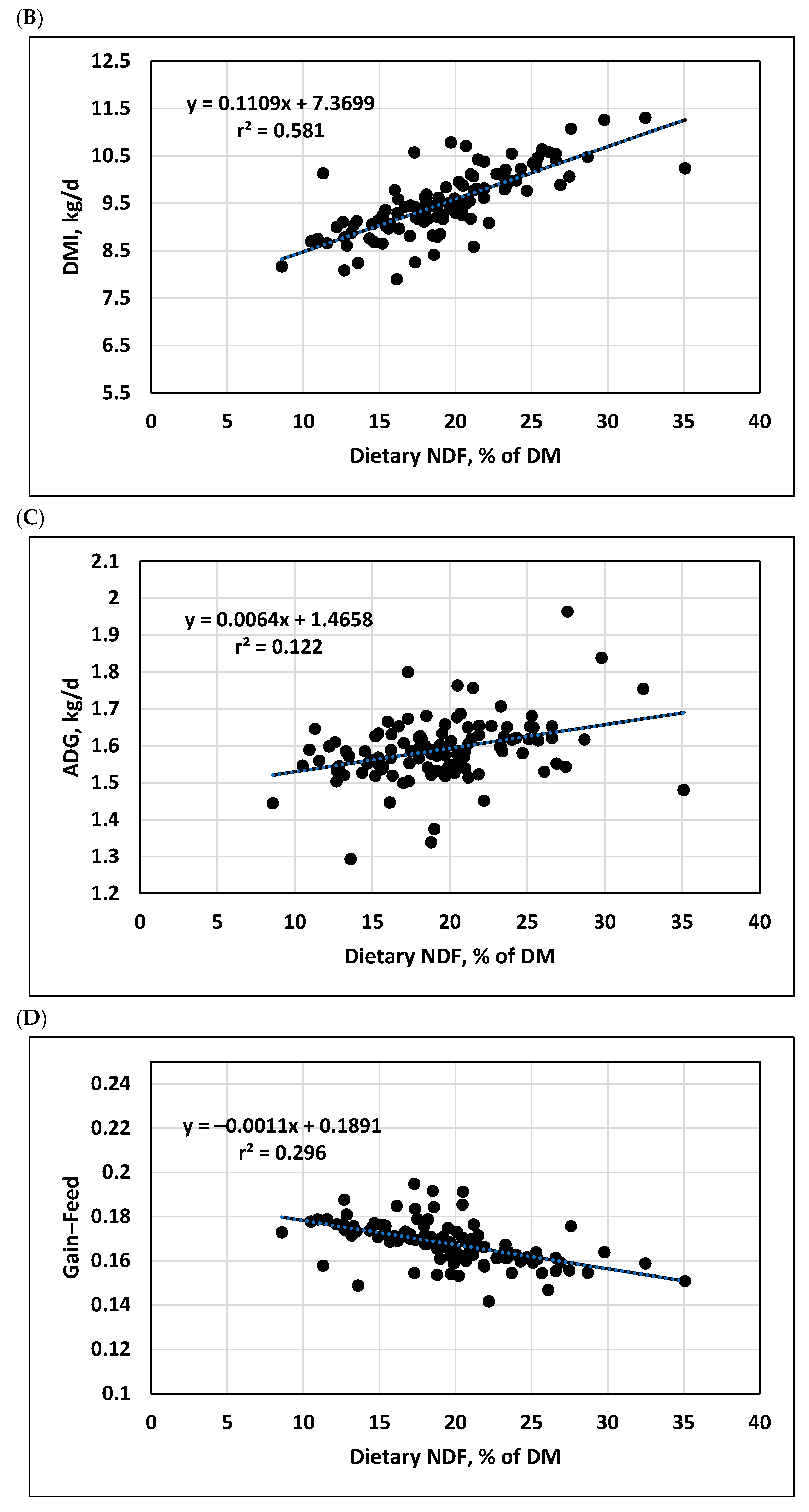 To reflect published data that were not included in the review of Galyean and Defoor [2], the peer-reviewed literature published between January 2004 and May 2025 was appraised using search engines (e.g., Google Scholar or specific journal websites) to identify studies with feedlot beef cattle that evaluated the effects of roughage source or concentration, and the related effects of NDF source and concentration, on growth performance. For inclusion in the database, studies were required to have growth performance data for cattle fed for an extended period until harvest and dietary composition data, particularly NDF, or at least the ability to calculate dietary components from dietary ingredients. Twenty-three studies (110 treatment means) were identified for inclusion in the database. Growth performance data included days on feed, initial and final BW, DMI, average daily gain (ADG), gain–feed ratio (G:F), and hot carcass weight (HCW). Dietary composition data included NDF, crude protein (CP), starch, and tabular concentrations [6] of net energy for maintenance and gain (NEm and NEg, respectively). All studies included data for CP, but values for dietary NDF and starch were not always reported. In such cases, diet composition information in the paper, along with tabular feed composition data [6], was used to calculate these values, resulting in 23% of the NDF values and 57.3% of the starch values being calculated from composition data. In addition to dietary composition data, the percentages of roughage and fibrous byproducts in the dietary dry matter (DM) were recorded, with percentages of NDF in these dietary components calculated from either reported or tabular NDF values depending on the availability of this information in the study. Descriptive statistics for the database are shown in Table 1, as well as the means and standard deviations for within-study ranges of measures related to dietary fiber. The complete database in spreadsheet format may be downloaded at https://www.depts.ttu.edu/afs/burnett_center/feedlot-fiber-database.php, accessed on 6 November 2025, and full citations for the studies included in the database are listed in Appendix A.