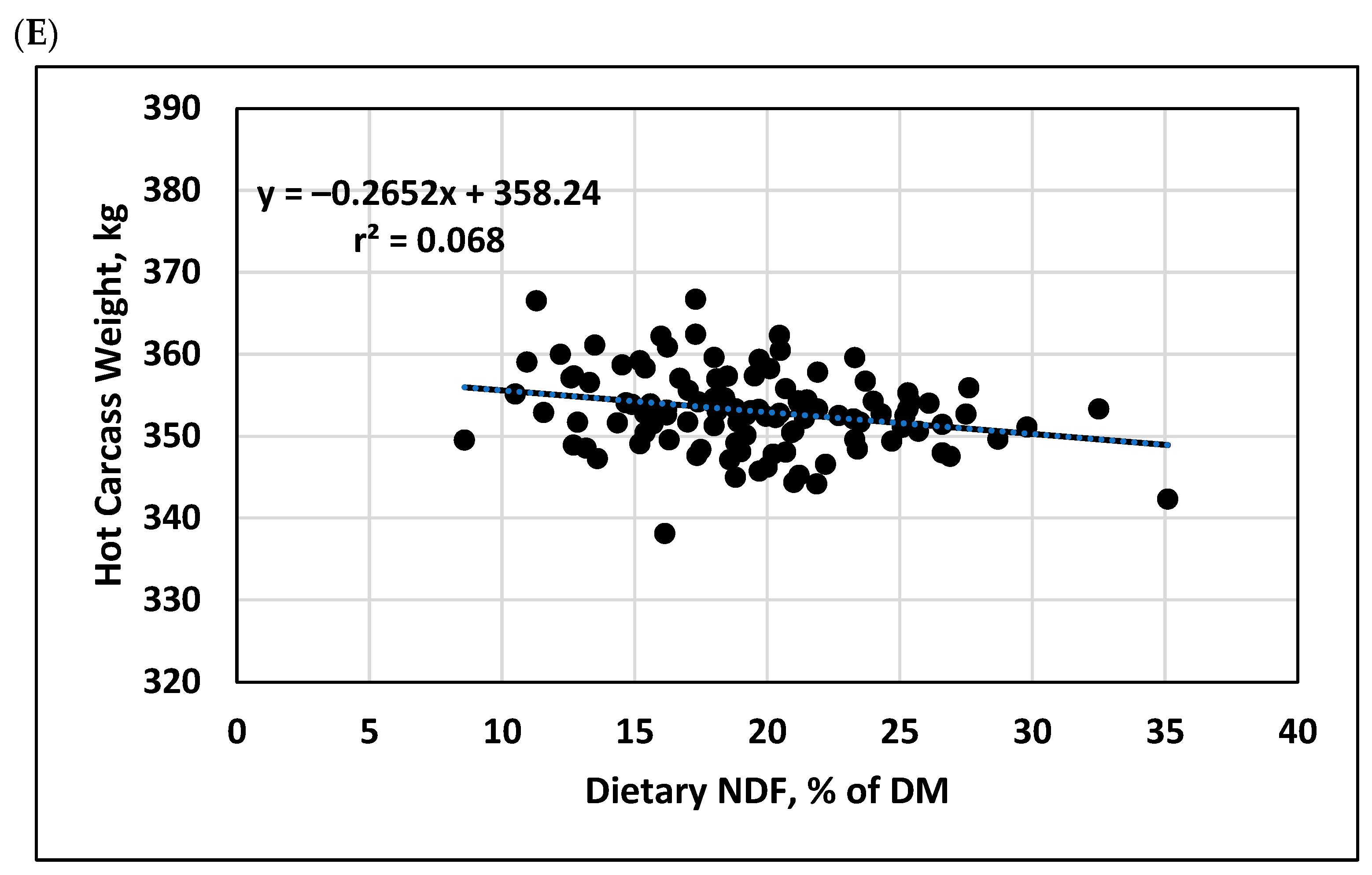 Figure 1. Study-adjusted relationships between growth performance data and dietary concentration of neutral detergent fiber (NDF): (A) Dry matter intake (DMI), % of body weight (BW); (B) dry matter intake, kg/d; (C) average daily gain (ADG), kg/d; (D) gain–feed ratio; and (E) hot carcass weight, kg. The blue-black dashed line in each figure represents the regression equation.