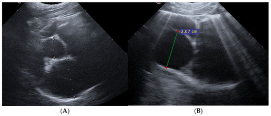 Left-sided CHF was diagnosed based on a history of sudden onset of increased respiratory rate or increased respiratory effort, as well as an abnormal point-of-care N-terminal pro-brain natriuretic peptide (NT-proBNP IDEXX Laboratories, Westbrook, ME, USA) blood test result and abnormalities on the lung ultrasound (such as B-lines) and cardiac POCUS that were compatible with the predefined criteria for CHF (see Section 2.2) [9,10,11,12,13,14,15,16,17,18,19,20,21,22]. NT-proBNP served as a point-of-care inclusion tool to support the clinical suspicion of CHF; however, as the test was used qualitatively and not quantitatively, it was not analyzed statistically in this study. Cats were not included when (1) they received diuretics within a week prior to presentation to the emergency service; (2) had a normal or only mildly dilated left atrium size (LA:Ao < 1.8 and LAD < 18 mm); (3) the cat’s clinical condition did not allow safe further examination; or (4) the owner opted for immediate euthanasia.