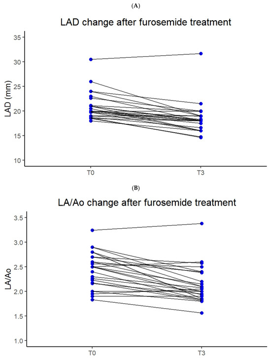 Spaghetti plots showing paired echocardiographic measurements for individual cats (n = 25) before (T0) and after (T3) parenteral furosemide administration. (A) Left atrial diameter (LAD). (B) Left atrium-to-aortic root ratio (LA:Ao). Each line connects values from the same cat at admission and after 3 h. The majority of cats showed a significant decrease in both LAD and LA:Ao (p < 0.001). One cat showed an increase in left atrium following treatment.