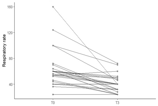 Spaghetti plot showing paired respiratory rate measurements for individual cats (n = 25) at baseline (T0) and at follow-up (T3). Each plot connects paired values from the same cat at admission and 3 h after intramuscular furosemide administration and oxygen therapy. The majority of cats showed a significant decrease in respiratory rate from T0 to T3 (p < 0.001).