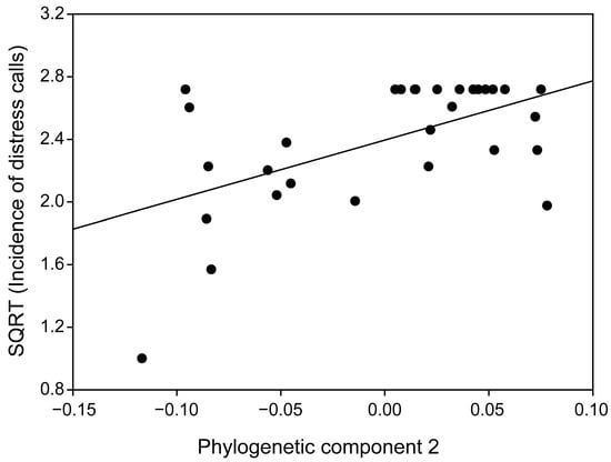 Relationship between the proportion of individuals emitting distress calls and the second phylogenetic component. Each black dot represents a different species.