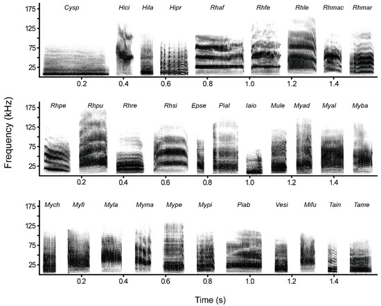 Spectrograms of bat distress calls. Cysp: Cynopterus sphinx. Hici: Hipposideros cineraceus. Hila: Hipposideros larvatus. Hipr: Hipposideros pratti. Rhaf: Rhinolophus affinis. Rhfe: Rhinolophus ferrumequinum. Rhle: Rhinolophus lepidus. Rhmac: Rhinolophus macrotis. Rhmar: Rhinolophus marshalli. Rhpe: Rhinolophus pearsonii. Rhpu: Rhinolophus pusillus. Rhre: Rhinolophus rex. Rhsi: Rhinolophus sinicus. Epse: Eptesicus serotinus. Pial: Pipistrellus alaschanicus. Iaio: Ia io. Mule: Murina leucogaster. Myad: Myotis adversus. Myal: Myotis altarium. Myba: Myotis badius. Mych: Myotis chinensis. Myfi: Myotis fimbriatus. Myla: Myotis laniger. Myma: Myotis macrodactylus. Mype: Myotis pequinius. Mypi: Myotis pilosus. Piab: Pipistrellus abramus. Vesi: Vespertilio sinensis. Mifu: Miniopterus fuliginosus. Tain: Tadarida insignis. Tame: Taphozous melanopogon.