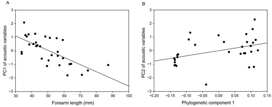 Relationships between (A) forearm length and the first principal component (PC1) of acoustic variables, and (B) the first phylogenetic component and the second principal component (PC2) of acoustic variables in bat distress calls. Each black dot represents a different species.