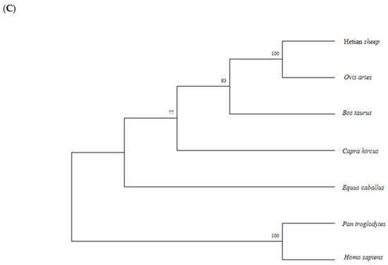 The sequencing results were assembled using DNAMAN 6.0, and homology searches were performed using BLAST on the NCBI website (https://blast.ncbi.nlm.nih.gov/Blast.cgi) (accessed on 3 September 2025). The physicochemical properties of the ID2 protein were predicted using the ProtParam website (https://web.expasy.org/protparam) (accessed on 3 September 2025). The hydrophobicity and transmembrane structure of the protein were predicted using Prot Scale software (https://web.expasy.org/protscale/) (accessed on 3 September 2025) and TMHMM 2.0 (https://services.healthtech.dtu.dk/services/TMHMM-2.0/) (accessed on 3 September 2025). Signal P 6.0 (https://services.healthtech.dtu.dk/services/SignalP-6.0/) (accessed on 3 September 2025) and Net Phosphorylation 3.1 (https://services.healthtech.dtu.dk/services/NetPhos-3.1/) (accessed on 3 September 2025) servers were used to predict signal peptides and phosphorylation sites. PSIPRED 4.0 (https://bioinf.cs.ucl.ac.uk/psipred/) (accessed on 3 September 2025) and Phyre 2.0 (http://www.sbg.bio.ic.ac.uk/phyre2/html/page.cgi?id=index) (accessed on 3 September 2025) were used to predict the secondary and tertiary structures of ID2 protein. The amino acid sequence alignment of Hetian sheep ID2 protein with other species was constructed using MEGA 11, and a phylogenetic tree was constructed using the neighbor-joining (NJ) method.