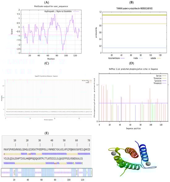 Characteristic analysis of sheep ID2 protein. (A) Hydrophilicity analysis of Hetian sheep ID2 protein. (B) Prediction of the transmembrane structure of Hetian sheep ID2 protein. (C) Prediction of the signal peptide of Hetian sheep ID2 protein. (D) Analysis of phosphorylation sites of Hetian sheep ID2 protein. (E) Prediction of secondary and tertiary structures of Hetian sheep ID2 protein.