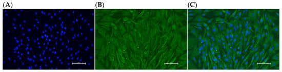 Identification of ovarian GCs in Hetian sheep. (A) DAPI-stained nuclei (blue); (B) FSHR-specific signal (green); (C) merged image. Positive cytoplasmic FSHR confirms GCs’ identity. Magnification: 200×.