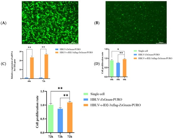 The ID2 gene was measured at 48 h and 72 h. Ovarian GCs showed a large amount of green fluorescent protein under the excitation of the blue light source of the fluorescence microscope Figure 7A,B. The expression of the ID2 gene increased with the increase in transfection time. After ID2 overexpression, the results of qRT-PCR showed that the mRNA level of the ID2 gene transfection group at 48 h and 72 h transfection was significantly higher than that of the blank group (p < 0.01), and the expression level gradually increased with time Figure 7C. The CCK-8 results are shown in Figure 7D. As time increases, it can be seen that the overexpression of the ID2 gene has a certain promoting effect on the proliferation of ovarian GCs (p < 0.01), which preliminarily proves that the ID2 gene can promote the proliferation of ovarian GCs.