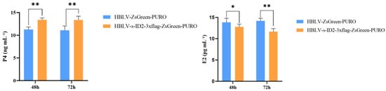 Effect of ID2 overexpression on E2 and P4 concentrations. * indicates p < 0.05, ** indicates p < 0.01.