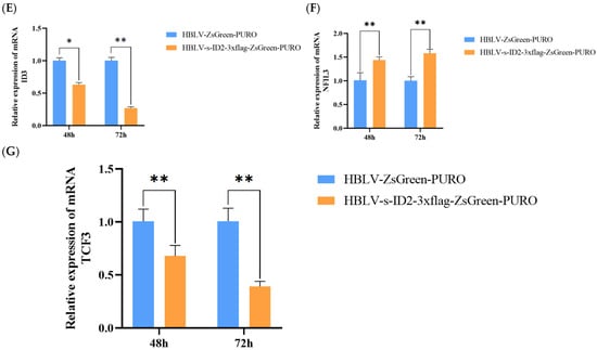 Effects of ID2 overexpression on the relative mRNA expression of BMPR2, RBX1, SMAD7, ID1, ID3, NFKL3, and TCF3 in GCs at 48 h and 72 h post-transfection. (A) represents the mRNA expression level of BMPR2 at 48 h and 72 h after ID2 overexpression. (B) represents the mRNA expression level of RBX1 at 48 h and 72 h after ID2 overexpression. (C) represents the mRNA expression level of SMAD7 at 48 h and 72 h after ID2 overexpression. (D) represents the mRNA expression level of ID1 at 48 h and 72 h after ID2 overexpression. (E) represents the mRNA expression level of ID3 at 48 h and 72 h after ID2 overexpression. (F) represents the mRNA expression level of NFKL3 at 48 h and 72 h after ID2 overexpression. (G) represents the mRNA expression level of TCF3 at 48 h and 72 h after ID2 overexpression. Bars represent mean ± SEM (n = 3 biological replicates). * indicates p < 0.05, ** indicates p < 0.01 (Independent Samples t-test).