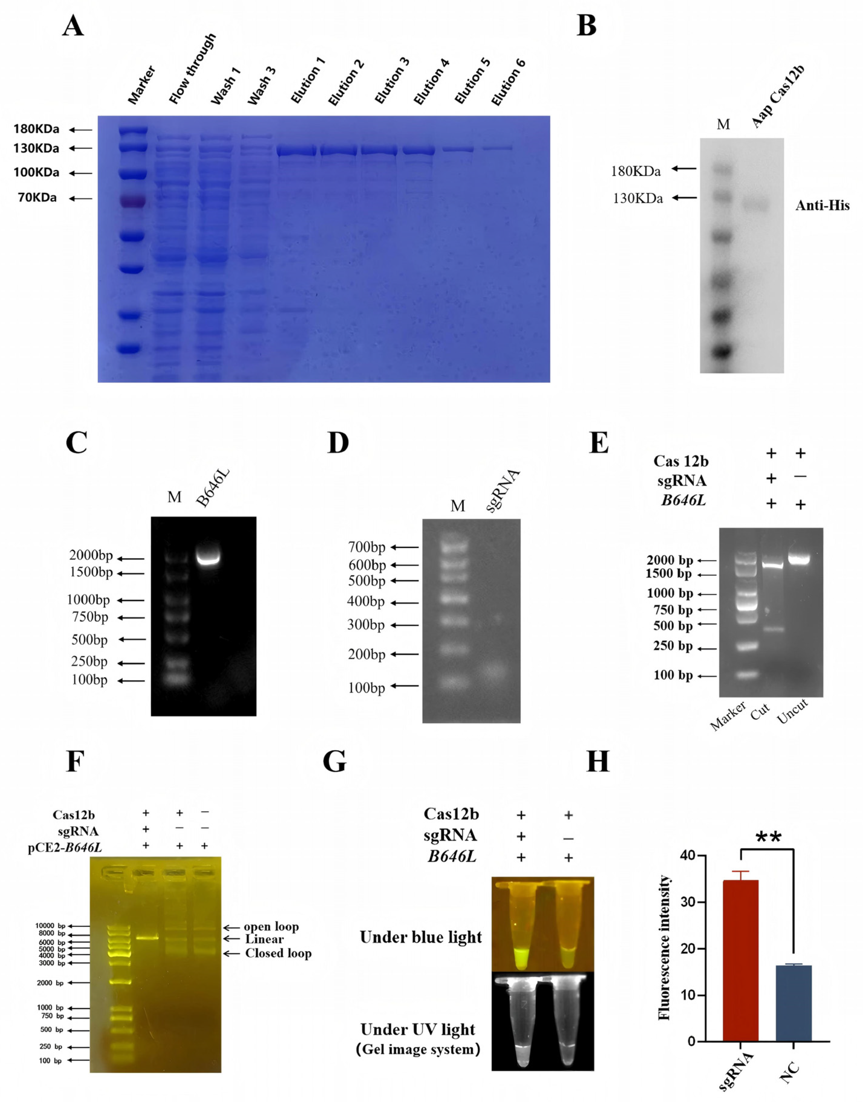 Figure 1. Expression and purification of AapCas12b protein and verification of its cleavage activities. (A) SDS-PAGE analysis Ni2+-NTA affinity chromatography purified His-labeled AapCas12b protein. (B) Western blotting detection of purified AapCas12b protein. (C,D) Analysis of B646L gene fragment of PCR products (C) and sgRNA (D) by agarose gel electrophoresis. (E,F) Verification of cis-cutting activity of AapCas12b protein on B646L gene fragment (E) and standard plasmid (F) by agarose gel electrophoresis. (G,H) Verification of trans-cleavage activity of AapCas12b protein, with the reaction detected under blue light and UV light (G), as well as by fluorescence signaling (H). NC, negative control without sgRNA. ** p < 0.01 by Student t test.