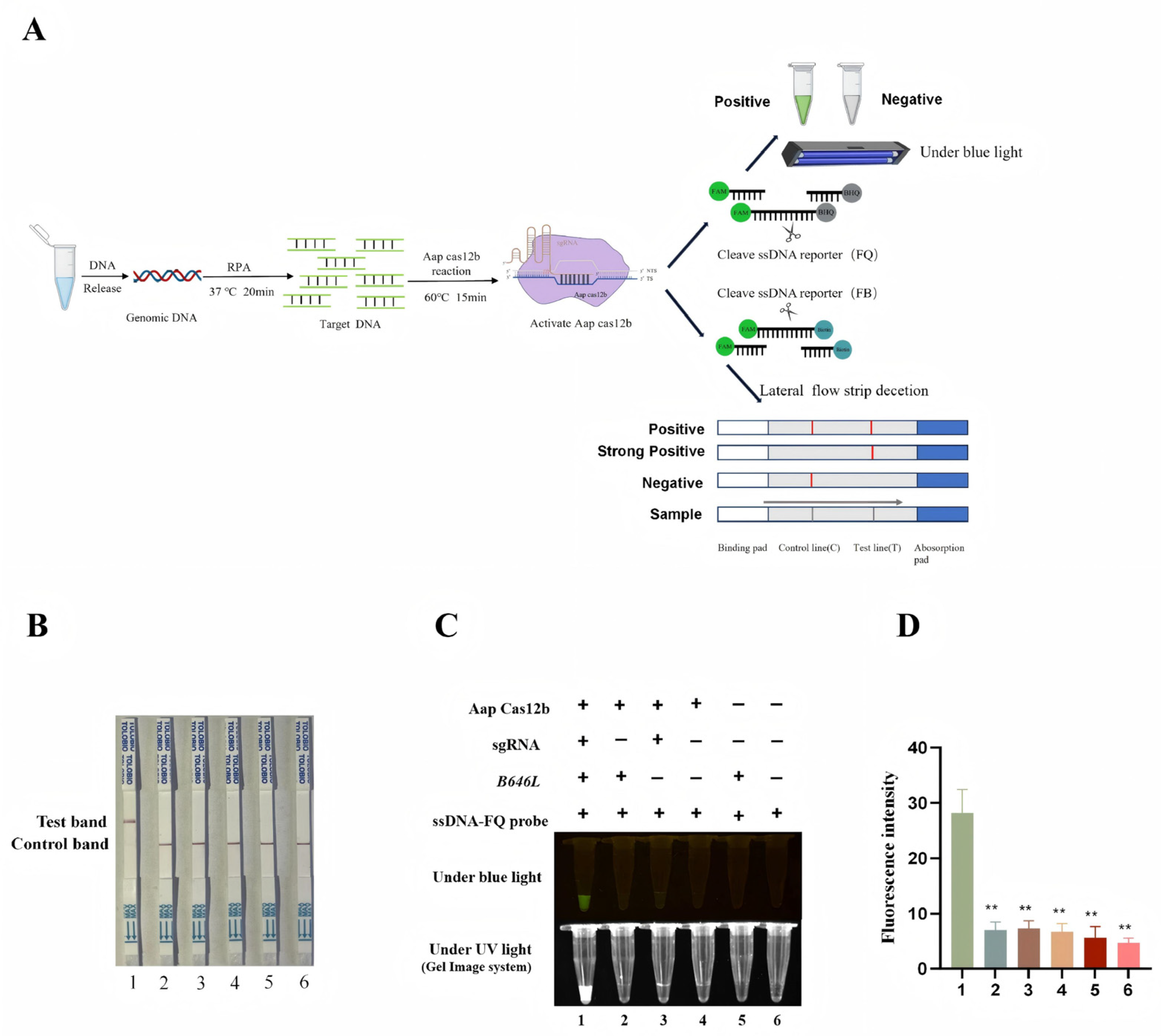 Figure 3. Establishment of CRISPR/AapCas12b mediated lateral flow test strip (LFS) method. (A) Schematic diagram of RPA-CRISPR/AapCas12b-LFS detection of ASFV. (B) The AapCas12b reactions were subjected to LFS detection. (C) The AapCas12b reactions were verified by blue light and UV light detection. (D) Green fluorescence signals were analyzed by ImageJ software. ** p < 0.01 versus No. 1 sample.
