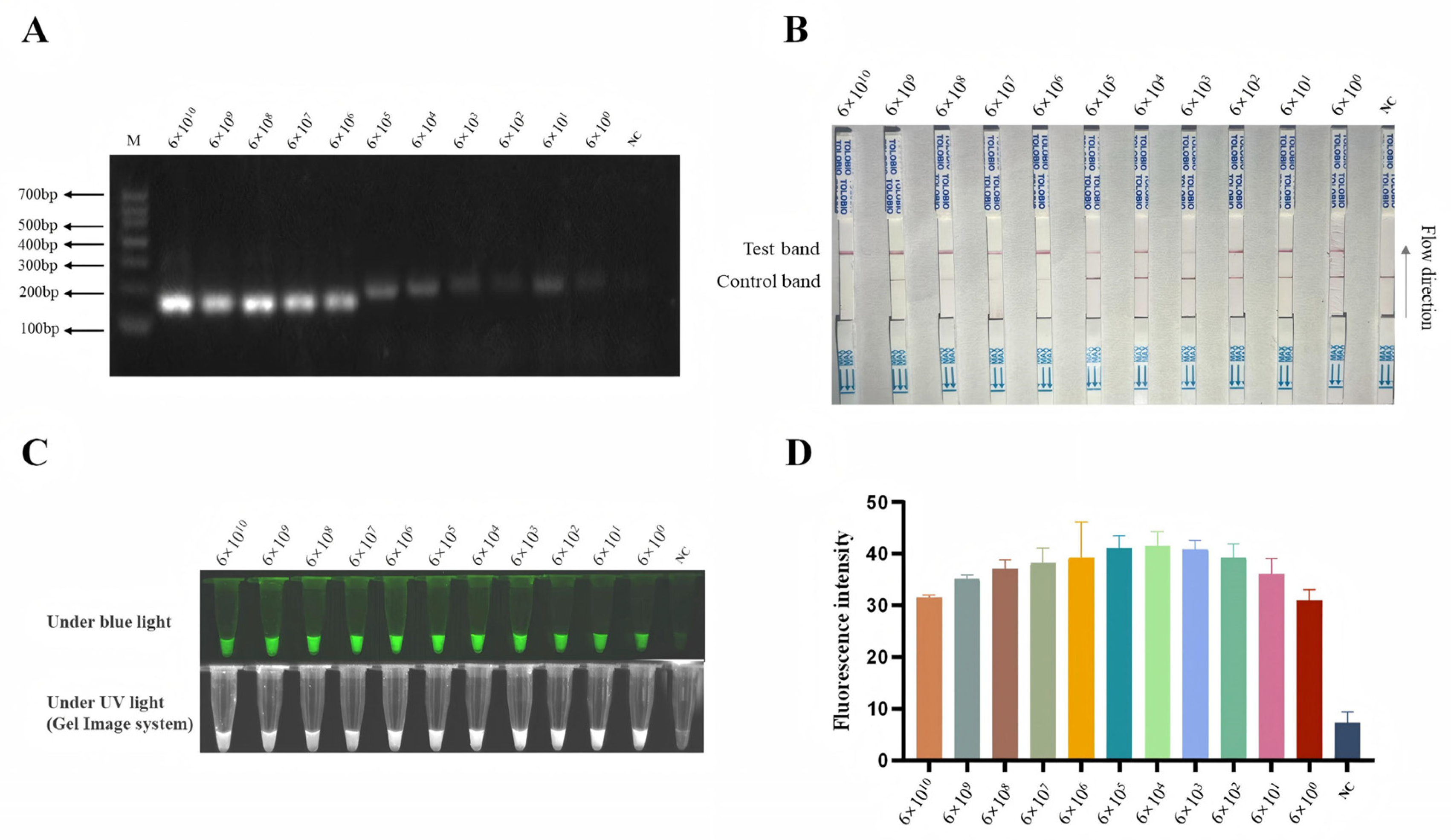 Figure 4. The sensitivity of B646L-RPA-CRISPR/AapCas12b-LFS detection. (A) RPA products of B646L amplified from pCE-B646L plasmid with different copy numbers. (B) The RPA products were detected by the CRSIPR/AapCas12b-LFS, and (C) The RPA products were detected by using blue light. (D) Green fluorescence signals were analyzed by ImageJ software.