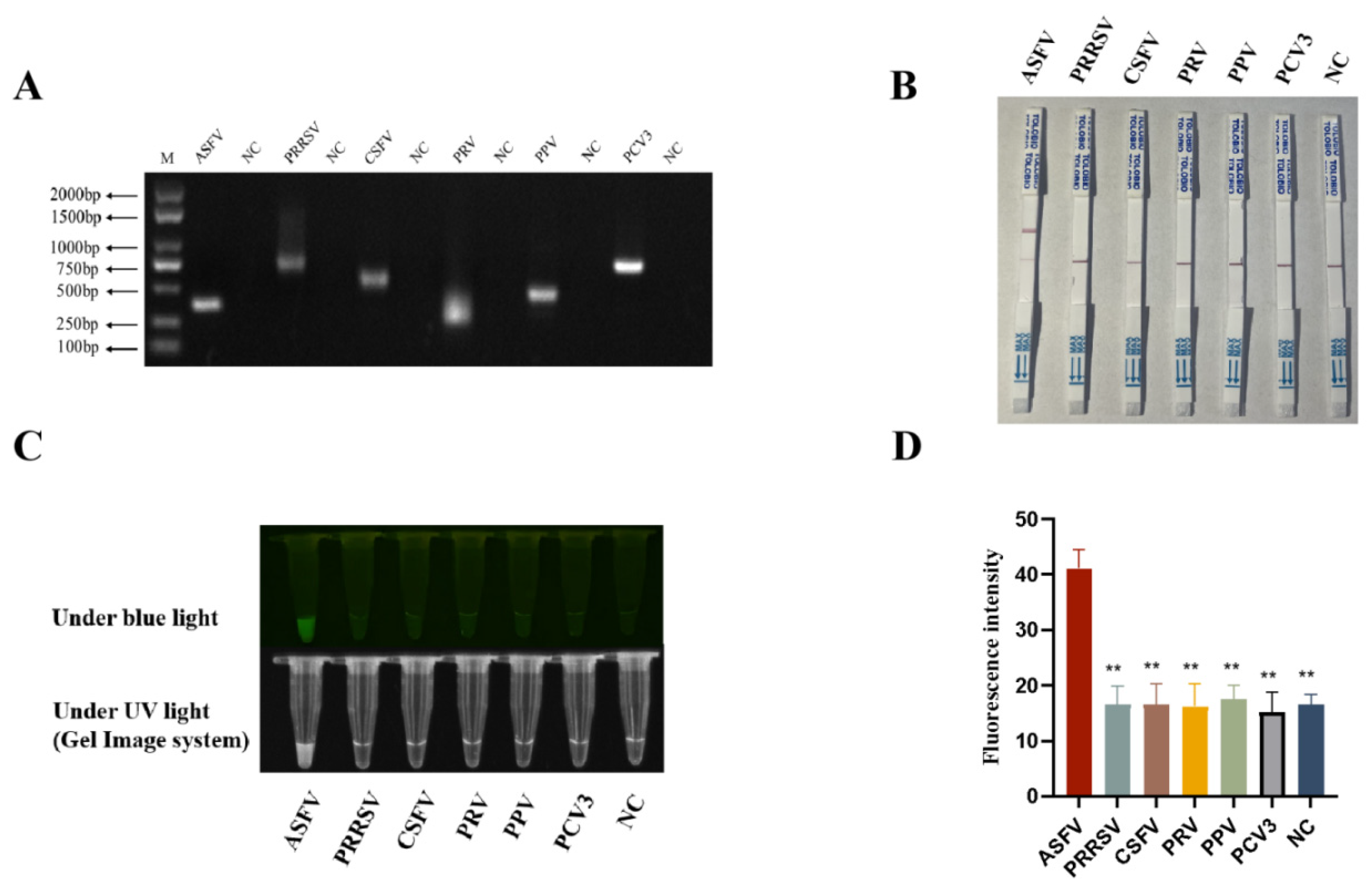 Figure 5. The specificity of RPA-CRISPR/AapCas12b-LFS detection. (A) The nucleic acid samples of five pig viruses and ASFV were all confirmed by RT-PCR for RNA viruses PRRSV and CSFV, and by PCR for DNA viruses ASFV, PRV, PPV4, and PCV3. (B) The RPA-CRISPR/AapCas12b detection specificity was examined by using LFS. (C) The RPA-CRISPR/AapCas12b detection specificity was verified by light detections. (D) Green fluorescence signals were analyzed by ImageJ software. ** p < 0.01 versus ASFV signal by Student’s t test.
