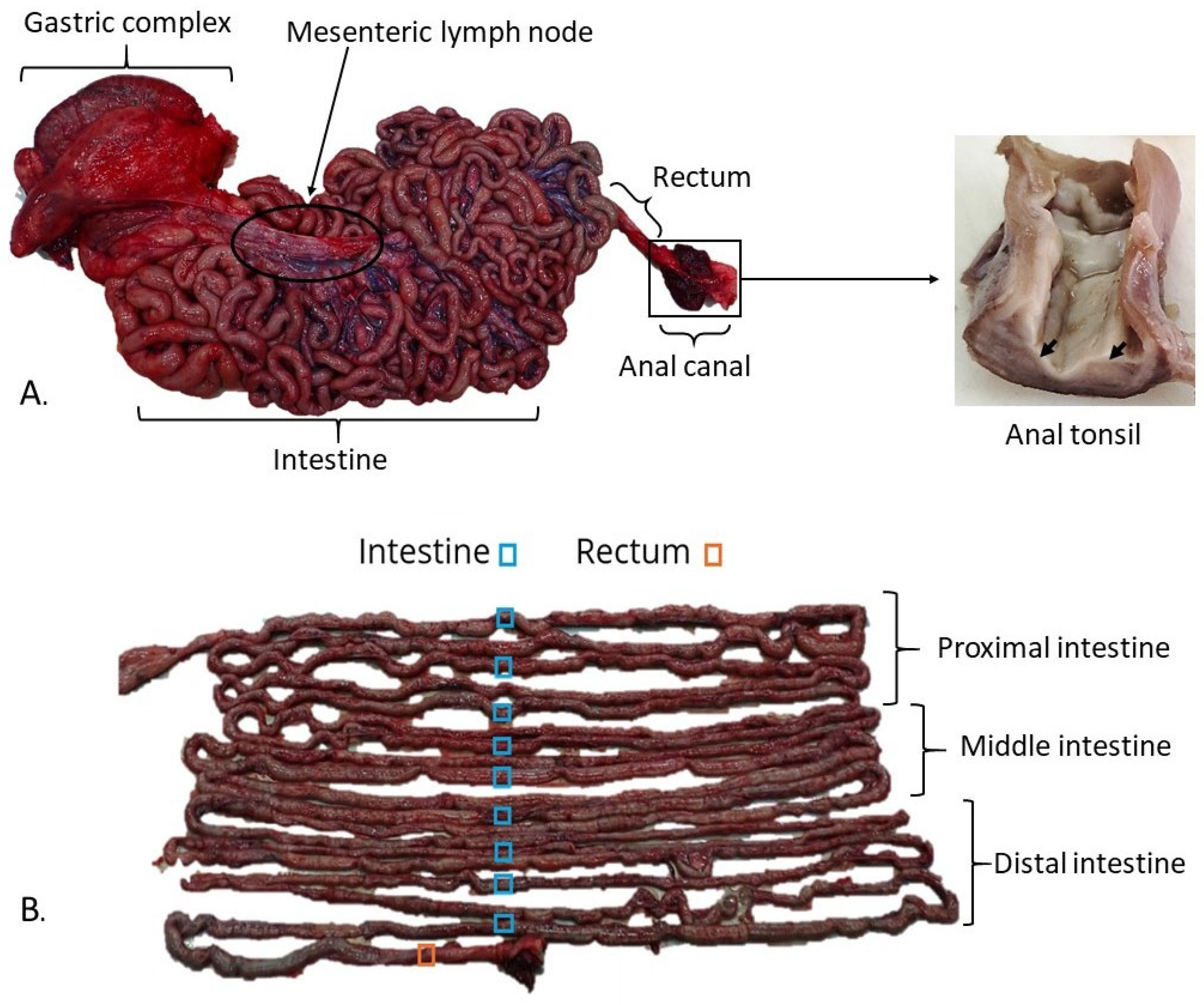 | Middle intestine 3 (MI3) | Simple columnar epithelium. Mucous glands. Muscularis mucosae very poorly developed. No villi. Few folds. Thickness: 373 µm. | No glands. No submucosal plexus. Thickness: 111 µm. | Inner and outer layers easily distinguishable. Myenteric plexus. Thickness: 408 µm (inner) and 124 µm (outer). |