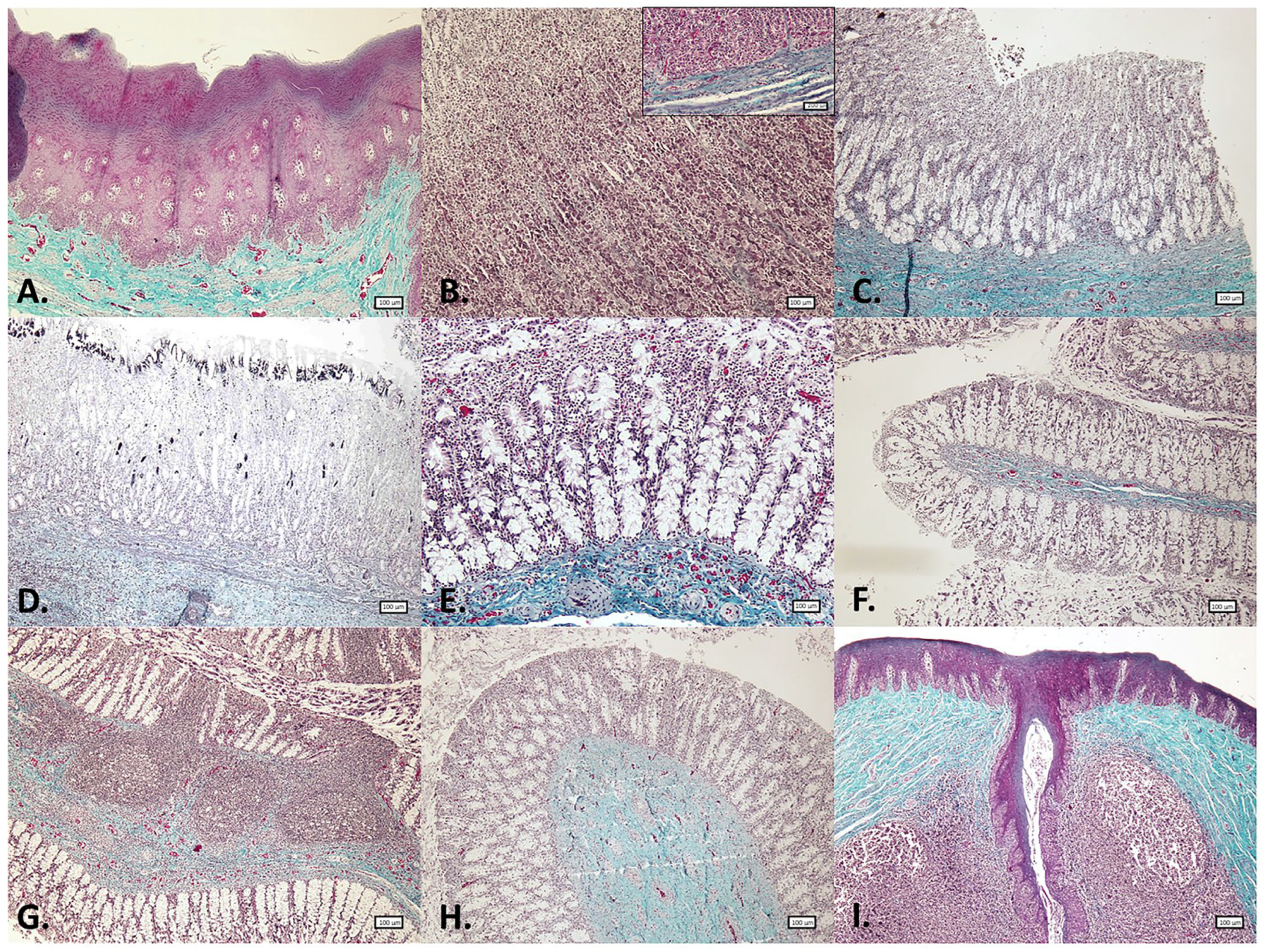 | Forestomach (FS) | Stratified keratinized epithelium. Muscularis mucosae highly developed. Absence of glands. Thickness: 937 microns (µm). | No glands. Submucosal plexus. Thickness: 252 µm. | Layers difficult to differentiate. Myenteric plexus. Thickness: 1430 µm. |
