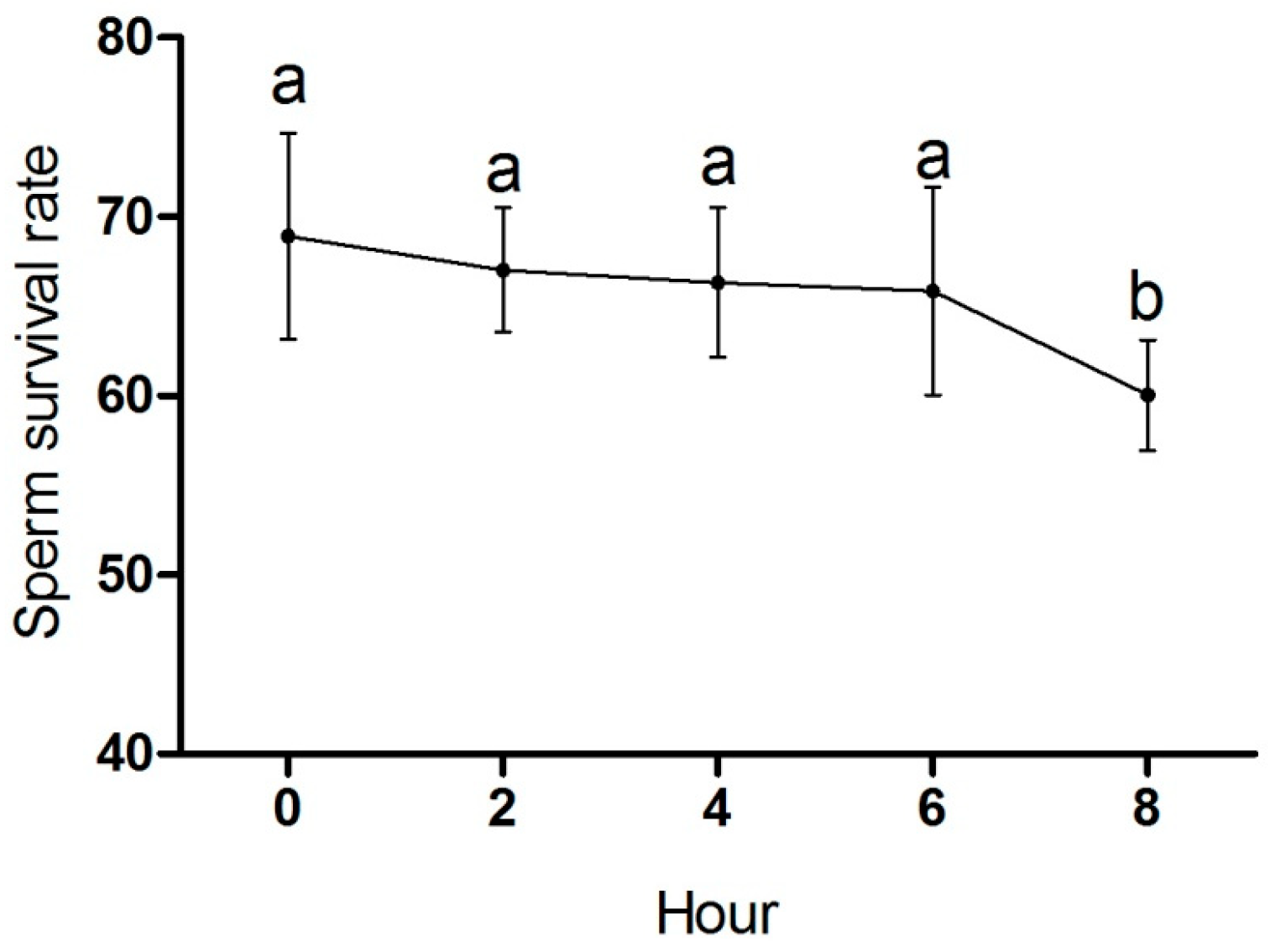 | Sperm survival rate (%) | 76.98 ± 5.67 b | 81.08 ± 3.85 a | |