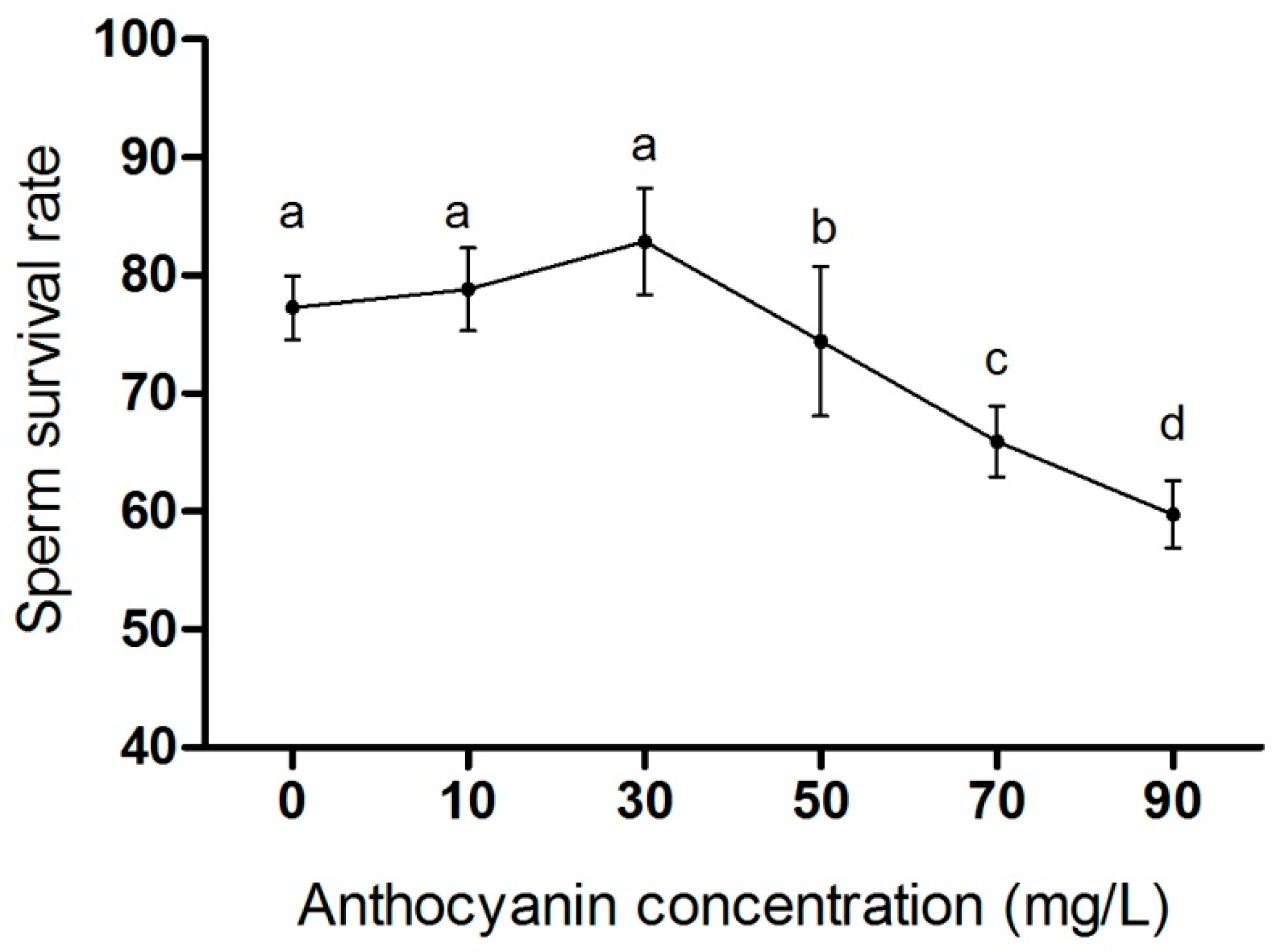 3.3. Effects of Different Anthocyanin Concentrations on Sperm Survival Rate of Zi Geese