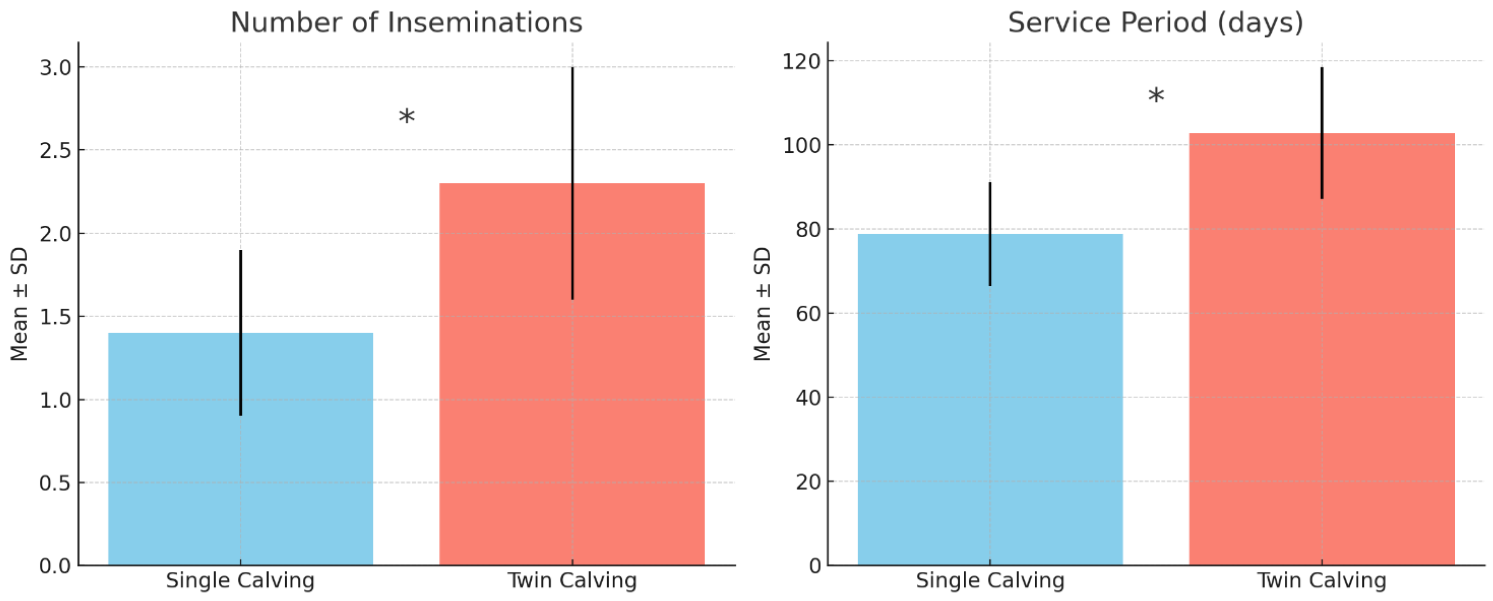 3.4. Number of Inseminations and Service Period Following Single vs. Twin Calvings