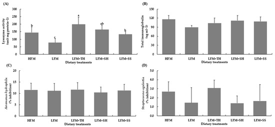 Lysozyme activity (A), total immunoglobulin (B), and plasma clearance efficiency against Aeromonas hydrophila (C) and Streptococcus agalactiae (D) in Asian seabass after 8 weeks of feeding. Values are means ± SD (n = 5). Different letters indicate statistical differences (p < 0.05) among the treatments. Abbreviations: HFM, high-fish-meal diet; LFM, low-fish-meal diet; LFM + TH, LFM diet + tuna hydrolysate; LFM + SH, LFM diet + shrimp hydrolysate; and LFM + SS, LFM diet + salmon silage.