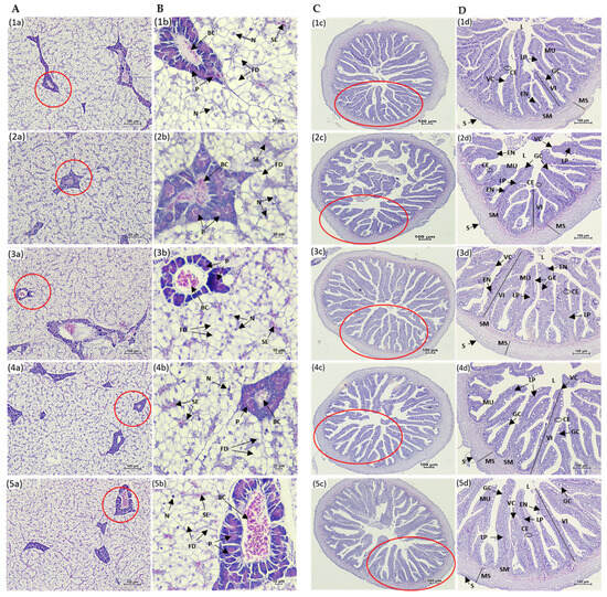 Histological sections of the liver (A,B) and distal intestine (C,D) of Asian seabass after 8 weeks of feeding. Panels: (1a–d) HFM; (2a–d) LFM; (3a–d) LFM + TH; (4a–d) LFM + SH; and (5a–d) LFM + SS. Images at 4× magnification (A,C) and 40× magnification (B,D). Panels (B,D) were taken from the regions indicated by the red circles in panels (A,C), respectively. Abbreviations: CE, columnar epithelium; EN, enterocytes; GC, goblet cells; L, lumen; LP, lamina propria; MU, mucosa; MS, muscularis; VC, villous core containing blood and lymph capillaries; VI, villi; S, serosa; SM, submucosa; N, nuclei; FD, fat deposits; SE, sinusoid erythrocytes; P, pancreatic cells; and BC, blood congestion.