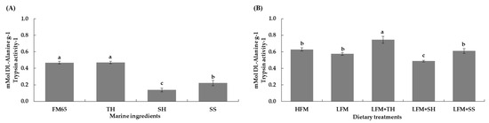 In vitro protein digestibility of marine ingredients (A) and experimental diets (B). Values are presented as means ± SD (n = 5). Different letters indicate statistical differences (p < 0.05) among the treatments. Abbreviations: FM65, fish meal 65% crude protein; TH, tuna hydrolysate; SH, shrimp hydrolysate; SS, salmon silage; HFM, high-fish-meal diet; LFM, low-fish-meal diet; LFM + TH, LFM diet + tuna hydrolysate; LFM + SH, LFM diet + shrimp hydrolysate; and LFM + SS, LFM diet + salmon silage.
