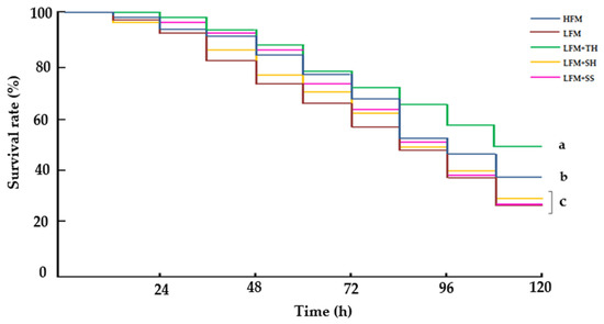 Survival rates of Asian seabass following a 120 h ammonia stress challenge (Kaplan–Meier survival method, followed by log-rank test, p < 0.05). Values are presented as means ± SD (n = 3). Different letters indicate statistical differences (p < 0.05) among the treatments. Abbreviations: HFM, high-fish-meal diet; LFM, low-fish-meal diet; LFM + TH, LFM diet + tuna hydrolysate; LFM + SH, LFM diet + shrimp hydrolysate; and LFM + SS, LFM diet + salmon silage.
