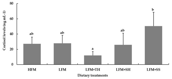 Cortisol levels in Asian seabass following a 120 h ammonia stress challenge. Values are presented as means ± SD (n = 5). Different letters indicate statistical differences (p < 0.05) among the treatments. Abbreviations: HFM, high-fish-meal diet; LFM, low-fish-meal diet; LFM + TH, LFM diet + tuna hydrolysate; LFM + SH, LFM diet + shrimp hydrolysate; and LFM + SS, LFM diet + salmon silage.