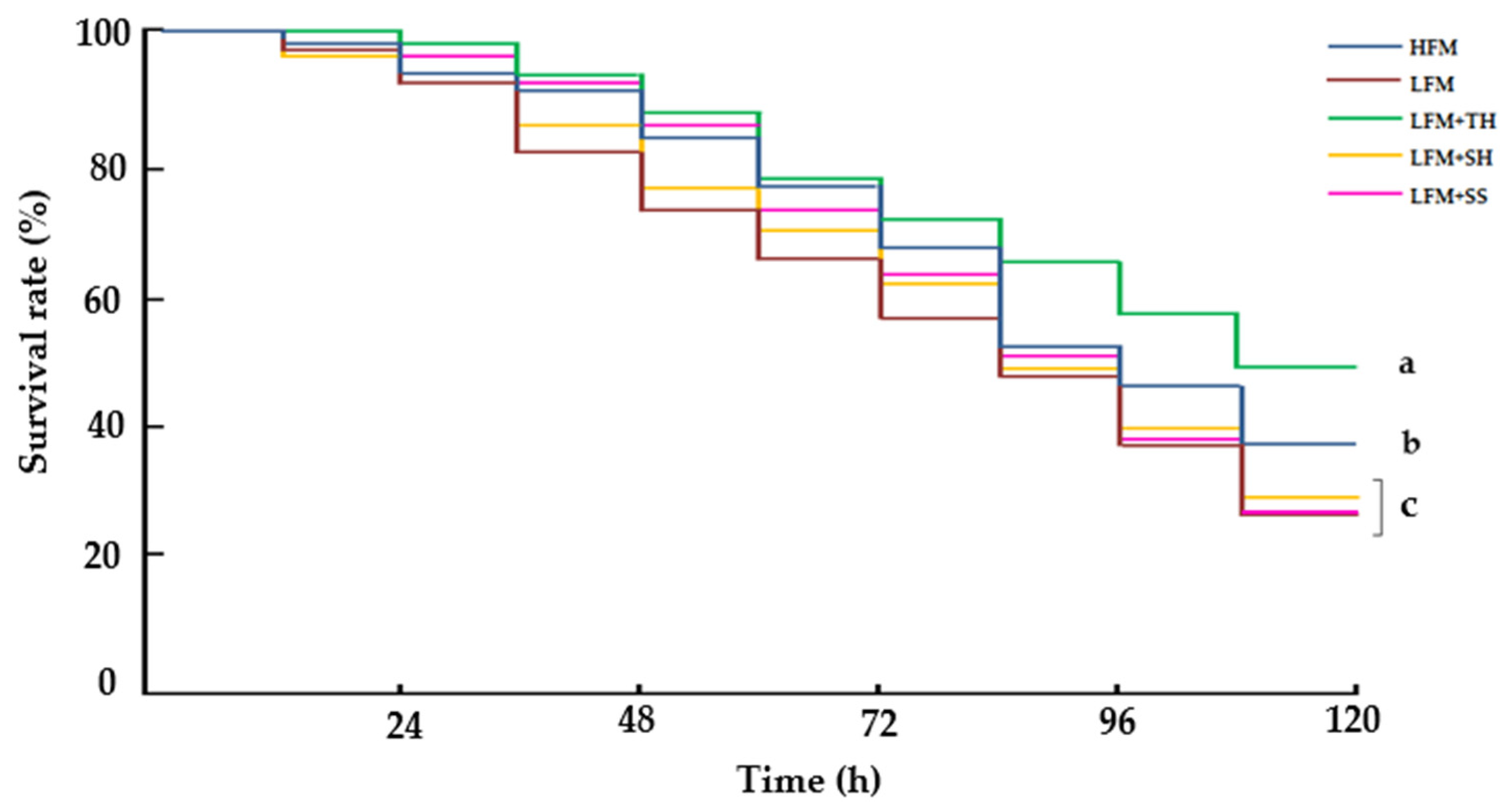 Table 1. TH was derived from tuna viscera via enzymatic hydrolysis, SH from shrimp processing waste (35–45% inedible), and SS from category 3 salmon by-products treated with 2% formic acid and gut enzymes. All marine ingredients were provided by Marine and Feed, SPF Diana Thailand Co., Ltd (Symrise group), Samutsakhon, Thailand. A high-FM diet (HFM) contained 25% fish meal, while a low-FM diet (LFM) replaced 60% of fish meal with soybean meal. Three additional diets were based on LFM, supplemented with 5% TH, 2% SH, or 5% SS (on a %, crude basis), and balanced for essential nutrients.