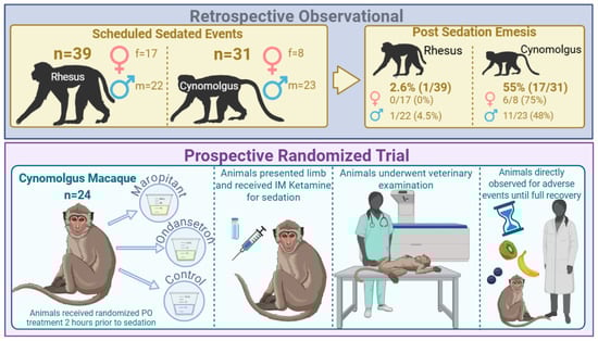 Rhesus macaques (Macaca mulatta) and cynomolgus macaques (Macaca fascicularis) are two of the most commonly used NHP species in research []. Despite differences in their biology [,], the incidence of emesis following sedation has not been directly compared between these species. However, one study has shown a higher likelihood of emesis in cynomolgus macaques compared to rhesus macaques after neurosurgical procedures []. Another previous study reported the incidence of ketamine-induced emesis in cynomolgus macaques to be 7.3–24.4%, with males experiencing a higher incidence of vomiting than females, though statistical significance was not assessed []. This underscores the clinical relevance of emesis in cynomolgus macaques, yet no studies have directly compared the efficacy of antiemetic agents in managing this issue around sedation.
