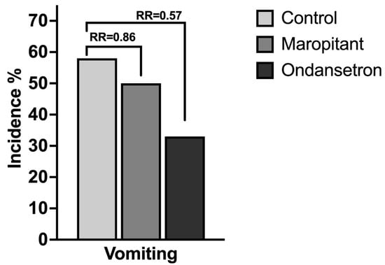 Incidence of emesis for maropitant and ondansetron versus placebo in cynomolgus macaques. Incidences of vomiting are presented (%), along with relative risk (RR). Both maropitant and ondansetron reduced the risk of vomiting, with an RR of 0.86 (0.3924 to 1.819) and 0.57 (0.2173 to 1.377), but this reduction was not significant.