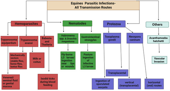 | Babesia caballi | Protozoan parasite, tick-borne (Rhipicephalus spp., Amblyomma spp., Dermacentor spp.) | Equine Piroplasmosis | Transplacental infection, abortion, or birth of infected foals (may show disease signs) | [129,130] |