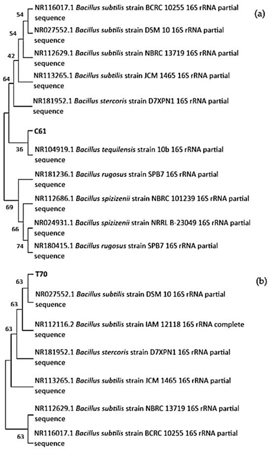 | C61 | Bacillus tequilensis and Bacillus subtilis strains | >99% | NR104919.1 | + | + | + | − | + | α | + | + | − |