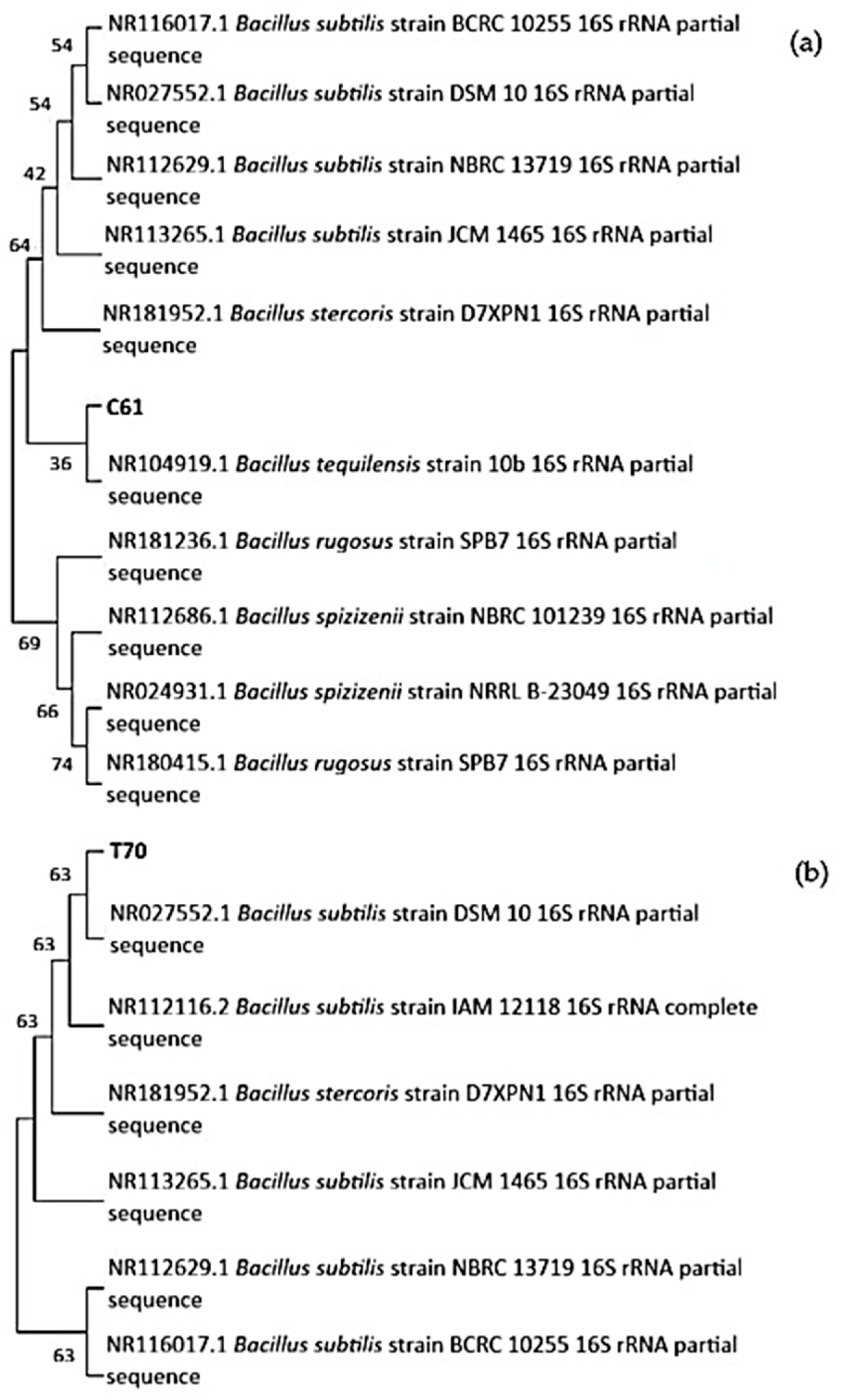 | T70 | Bacillus subtilis | 99.70% | NR027552.1 | + | + | + | − | − | α | + | + | + |
