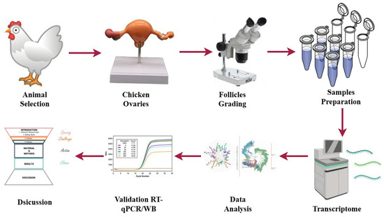 Follicles were carefully dissected with a stereomicroscope and categorized into four developmental stages based on size, pigmentation, and morphology: PRF (PF, <80 µm, distinguished by a single layer of flattened granulosa cells), PRF (PR, 80–1000 µm, exhibiting cuboidal granulosa cells), SWF (SWF, 2–4 mm, translucent), and SYF (SYF, 4–6 mm, yellow-pigmented). Follicles from three different animals were combined for each category to create biological triplicates (Figure 1). A total of twenty-four (n = 24) hens were used in this study, comprising twelve biological replicates per group (High-laying, n = 12; Low-laying, n = 12). For each biological replicate, RNA was extracted from the follicles of a single, individual hen. Therefore, each data point represents an independent biological sample.