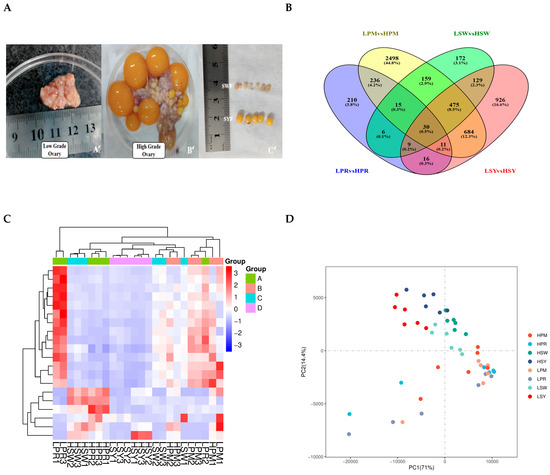 (A–D) Phenotypic and transcriptomic analysis of ovarian follicles in low- and high-laying hens. Representative images of low-grade and high-grade laying hen ovarian tissue illustrating follicle growth morphology: (A) High-grade ovaries exhibit a clearly defined yolky follicle structure (B’), whereas low-grade ovaries (A’) display less distinct structures. Dissected follicles were classified from SW to SY for transcriptome analysis (C’). (B) A Venn diagram illustrates the distribution and overlaps of differentially expressed genes (DEGs) in the PRF, PMF, SYF, and SYF follicle phases of low- and high-egg-laying hens. All follicular stages exhibited 30 differentially expressed genes (DEGs). (C) The heatmap illustrates the differentially expressed genes (DEGs) across all samples, revealing distinct expression patterns associated with follicle types and laying performance groups. Colour intensity represents Z-score-normalised expression levels. (D) The PCA map indicates that samples are differentiated based on follicle stage and egg-laying performance. The initial two principal components account for most of the variation, suggesting biological differences particular to the groups.