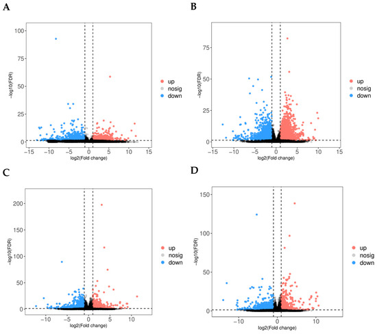 (A–D) Volcano plots display transcriptomic changes in (A) LPR vs. HPR, (B) LPM vs. HPM, (C) LSW vs. HSW, and (D) LSY vs. HSY follicles. The x-axis represents the log2 fold change (high vs. low), and the y-axis represents the −log10 of the false discovery rate (FDR). Significantly upregulated genes (FDR < 0.05, log2FC > 0) are shown in red, downregulated genes (FDR < 0.05, log2FC < 0) are shown in blue, and non-significant genes are shown in grey.